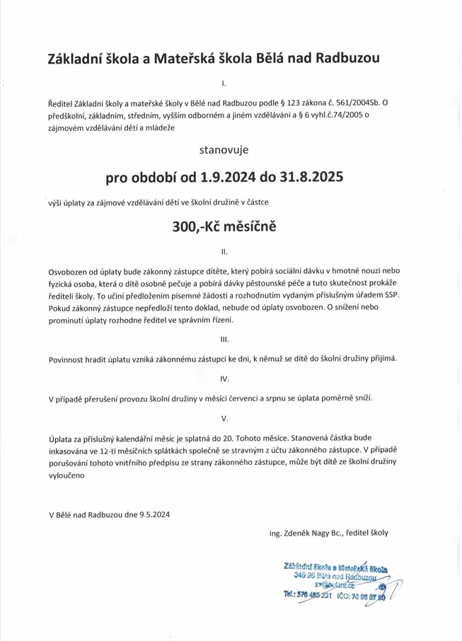 Výše úplaty za zájmové vzdělávání dětí ve školní družině pro období od 1.9.2024 do 31.8.2025.