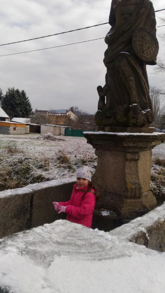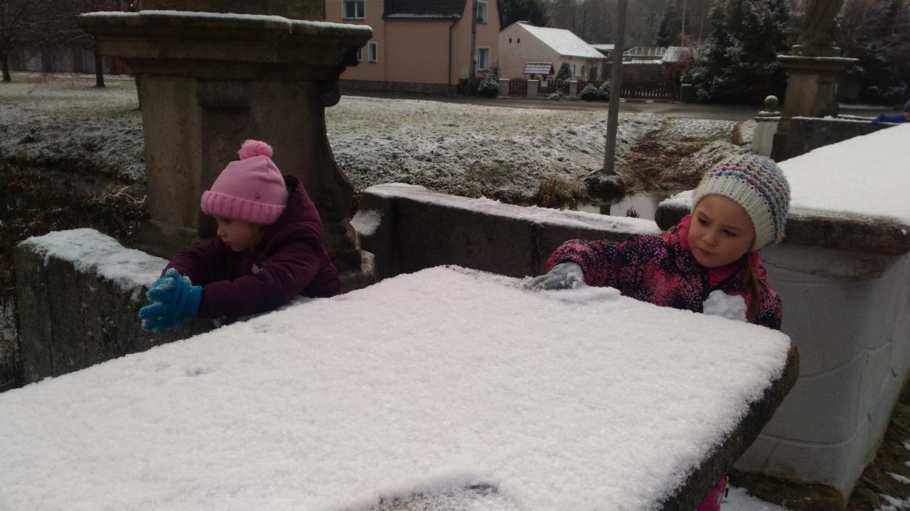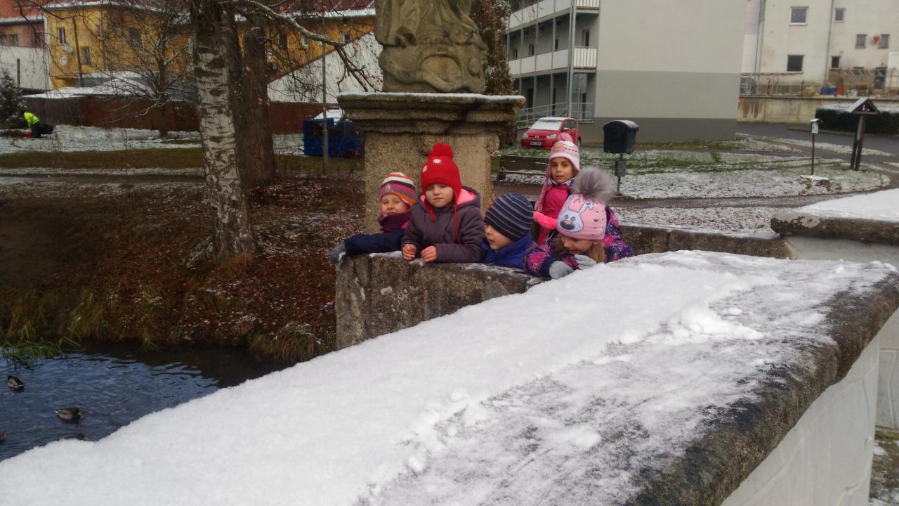 První sníh na barokním mostě.