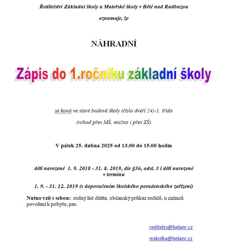 Dne 25.4. se koná náhradní zápis dětí do 1. třídy pro školní rok 2025/2026
